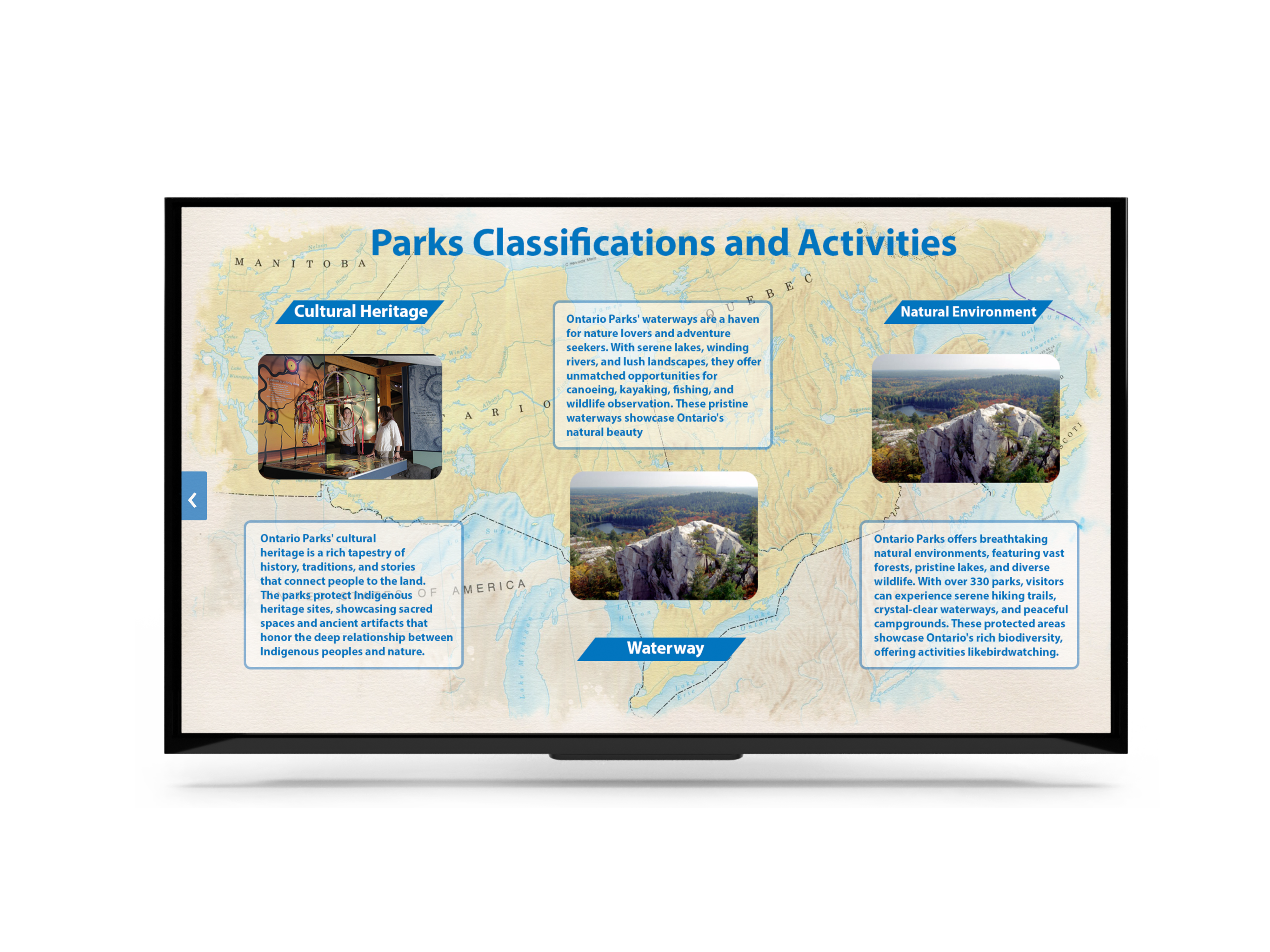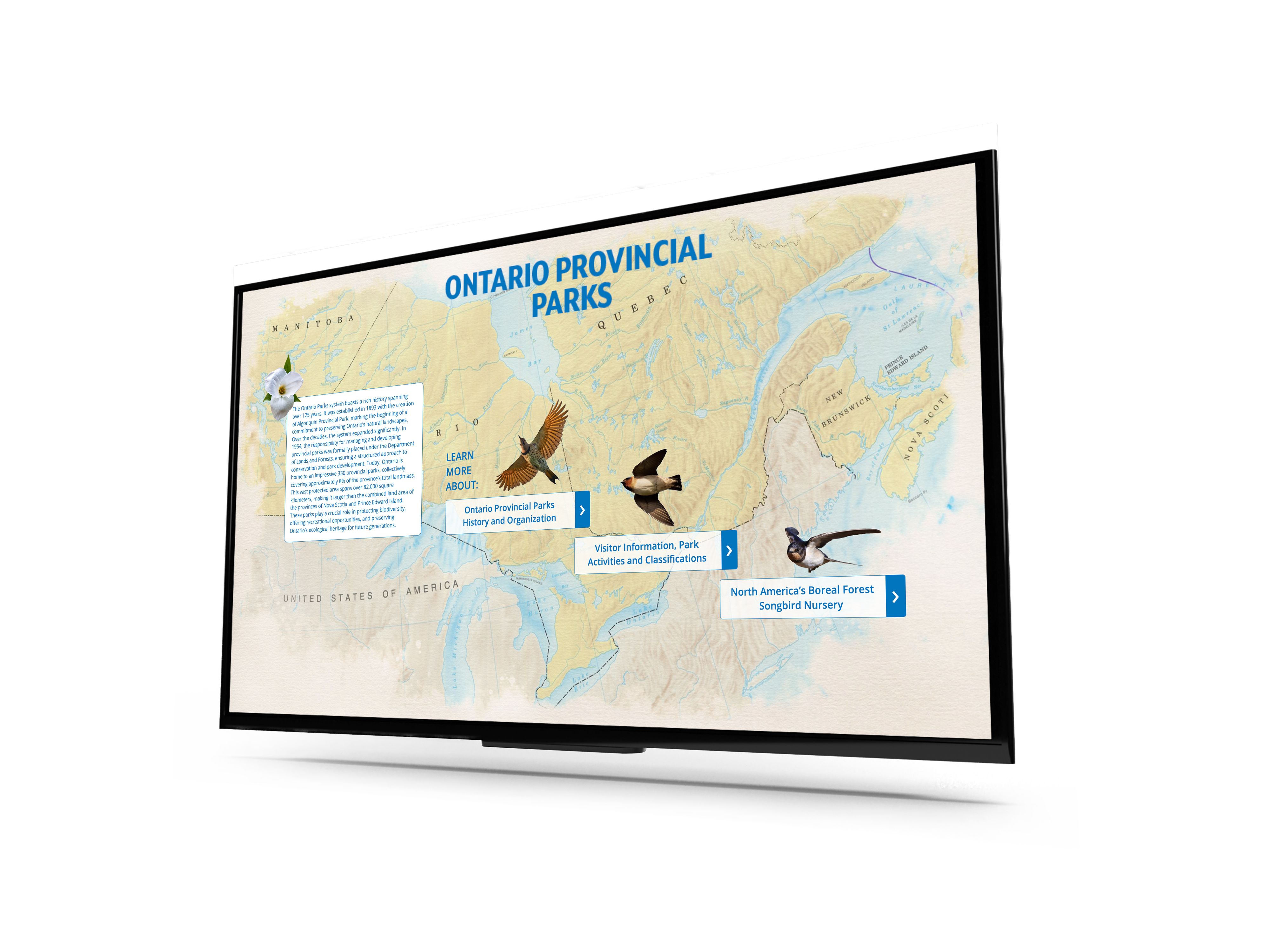 The Data-Driven Touchscreen App is a self-guided info system for Ontario Parks, designed for kiosks in locations like Visitor Centres and Park Offices. It features a touch-optimized, full-HD interface that delivers engaging content across four screens—covering park history, visitor info, and the boreal forest. Built with Photoshop mockups and developed using HTML, CSS, and JavaScript, the app combines strong visuals with smooth, interactive functionality.